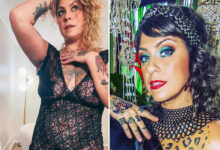 She draped a sheer tulle top over her shoulders, leaving her chest, belly, legs, and thigh tattoos exposed.